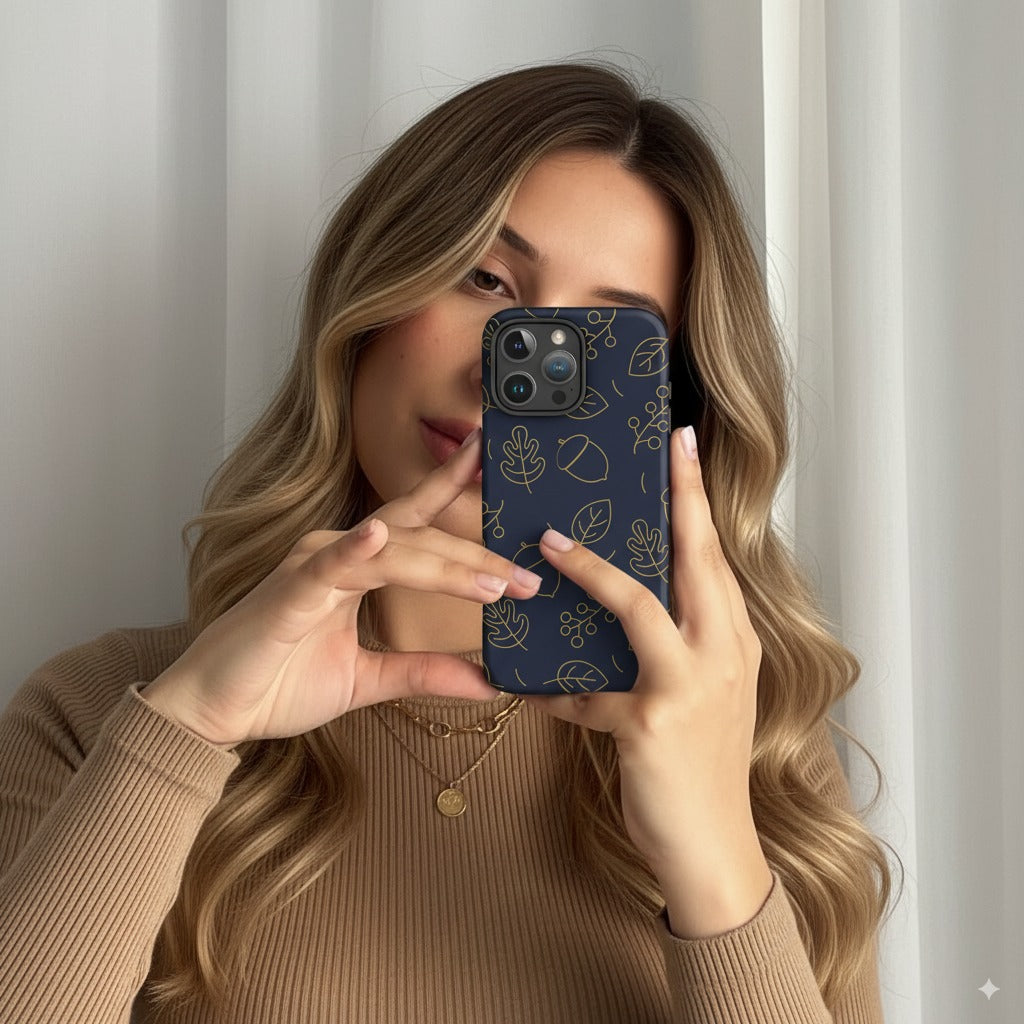 Protect your phone in style with this navy blue tough case featuring a delicate gold-line pattern of autumn leaves, acorns, and berries. Designed for both beauty and durability, this case brings cozy fall charm with a sleek matte finish and sturdy protection for your iPhone.