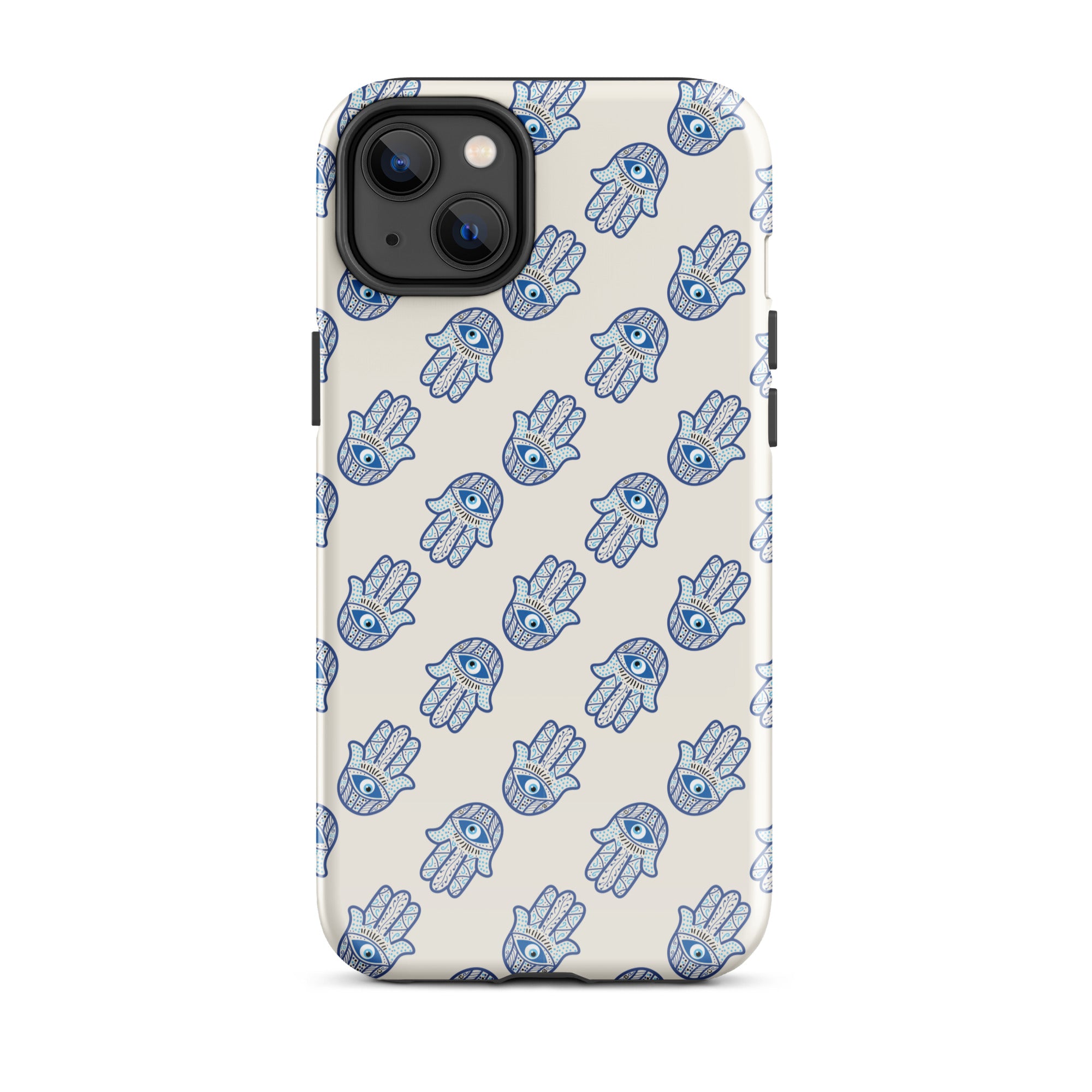 Protect your phone and your energy with this Hamsa Eye iPhone case. Adorned in a repeating pattern of blue Hamsa hands on a soft cream background, this design is all about warding off bad vibes while turning up the style.