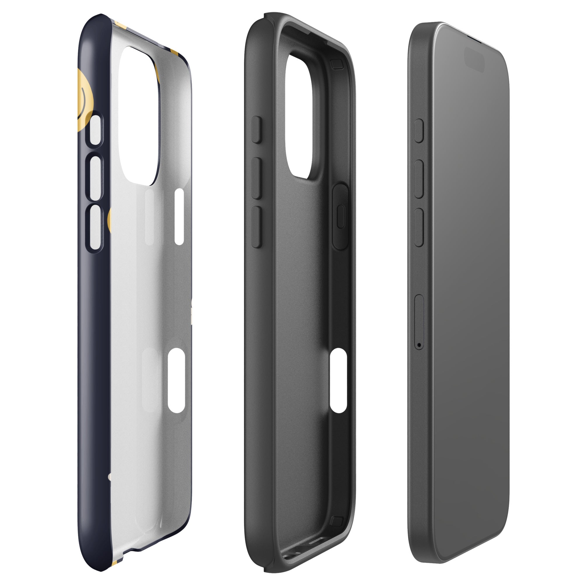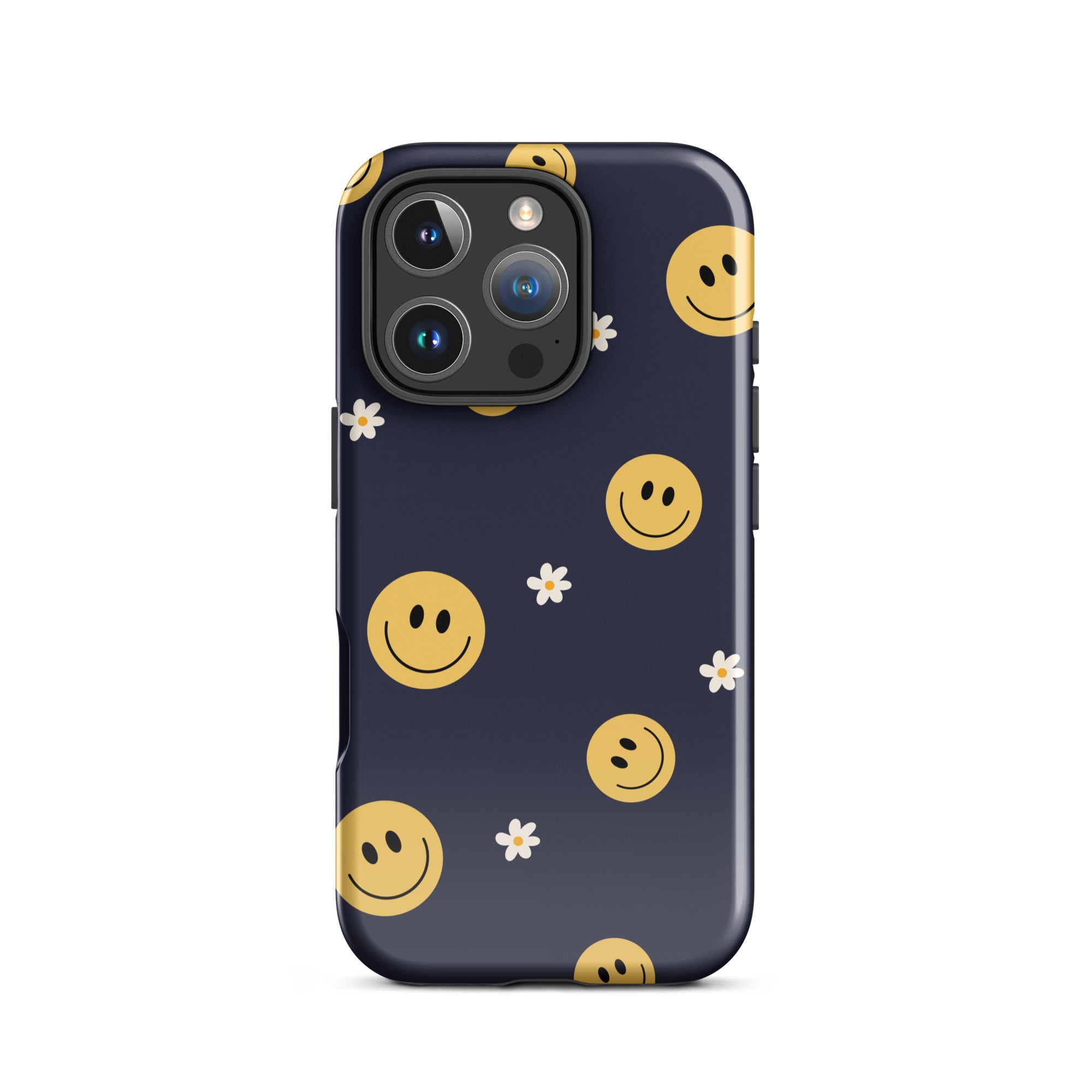Playful and positive, this tough iPhone case brings sunshine to your everyday. Featuring a navy blue background scattered with bold yellow smiley faces and delicate white daisies, it’s the perfect balance of retro charm and minimalist cheer. Designed to protect your phone in style, this case has a snug fit and a sleek, glossy or matte finish that’s as durable as it is joyful.