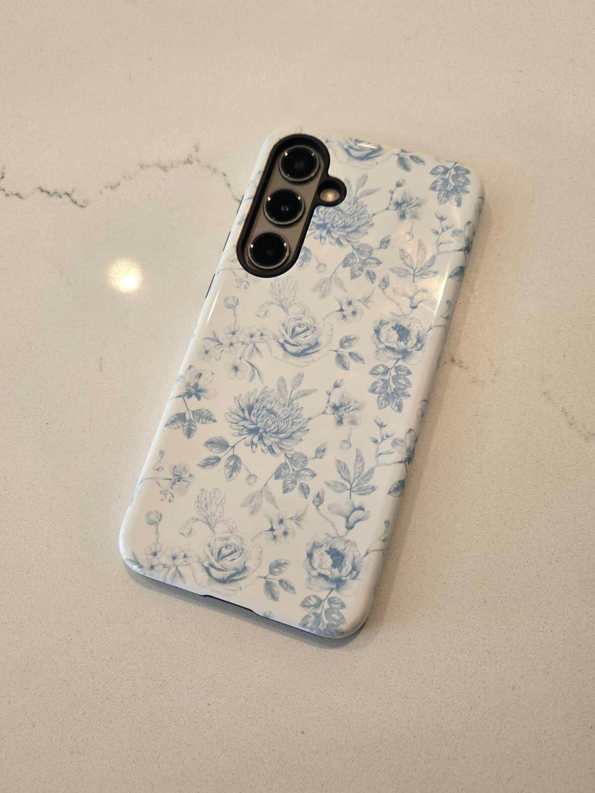 A soft cream base meets intricate blue florals in this French vintage-inspired Samsung case. The timeless toile pattern brings charm and sophistication to your everyday carry, while the tough dual-layer build keeps your phone protected from bumps and drops.